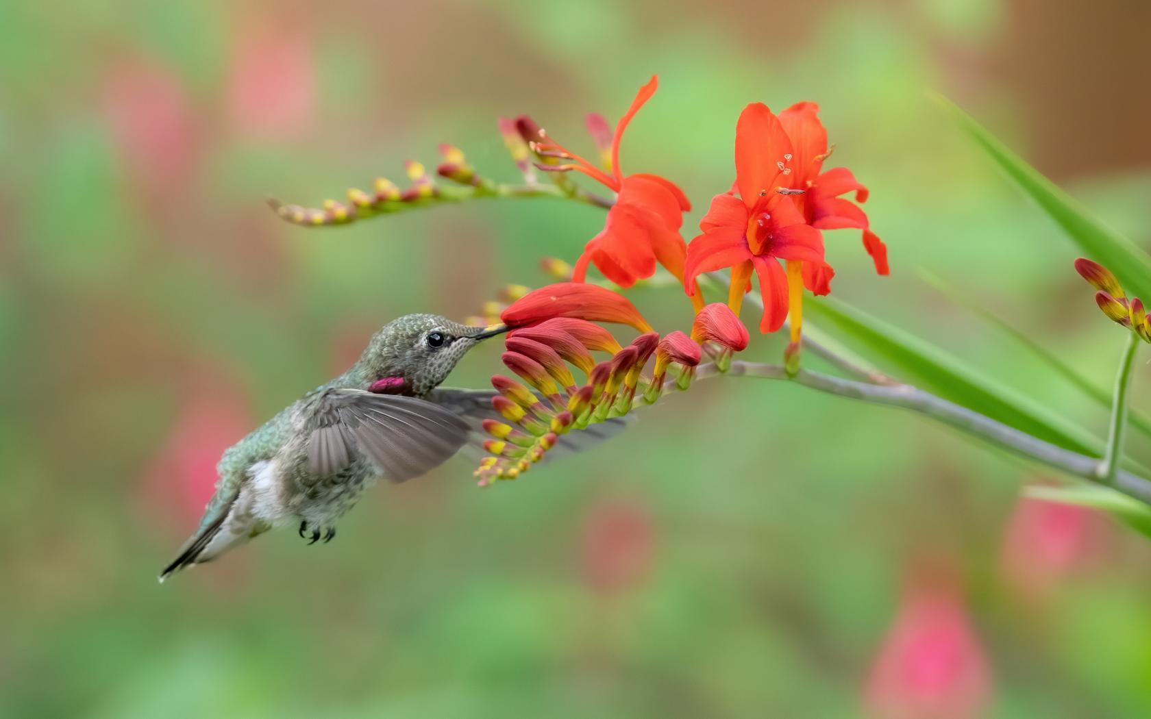 Wallpaper A tiny hummingbird bird drinks red flower nectar