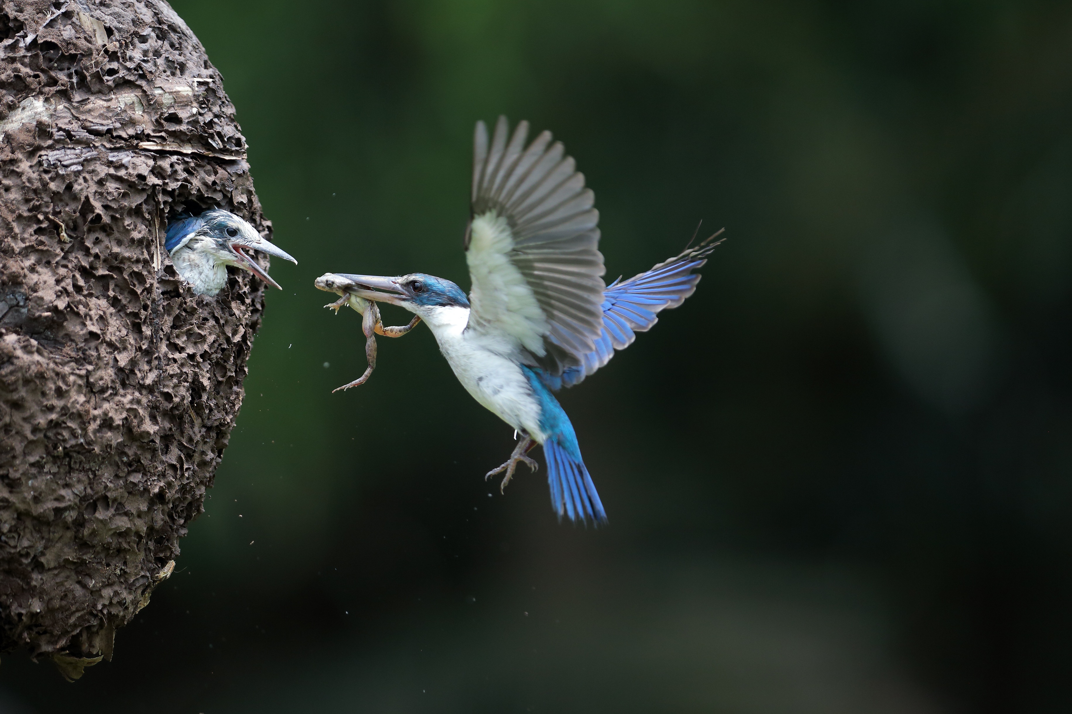 Wallpaper Kingfisher bird feeds the chicks in the nest