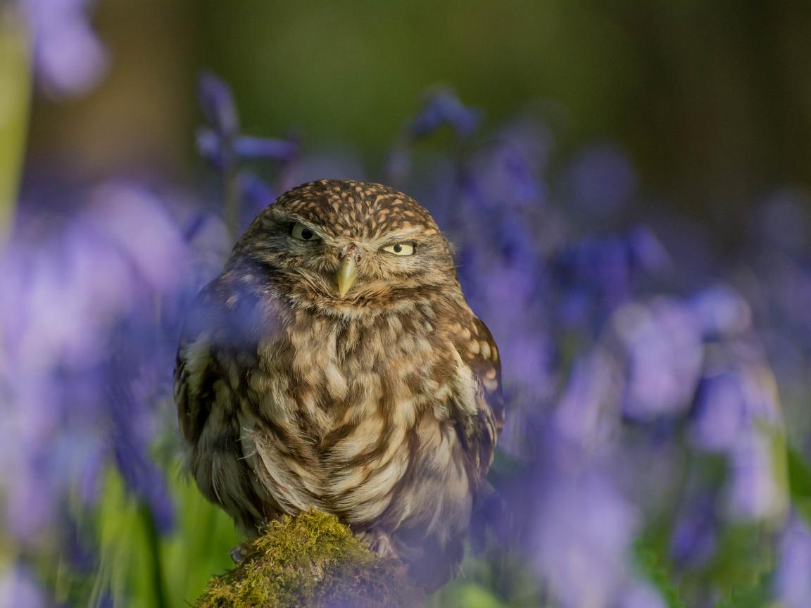 Wallpaper Predatory gray owl sitting on a background of blue flowers