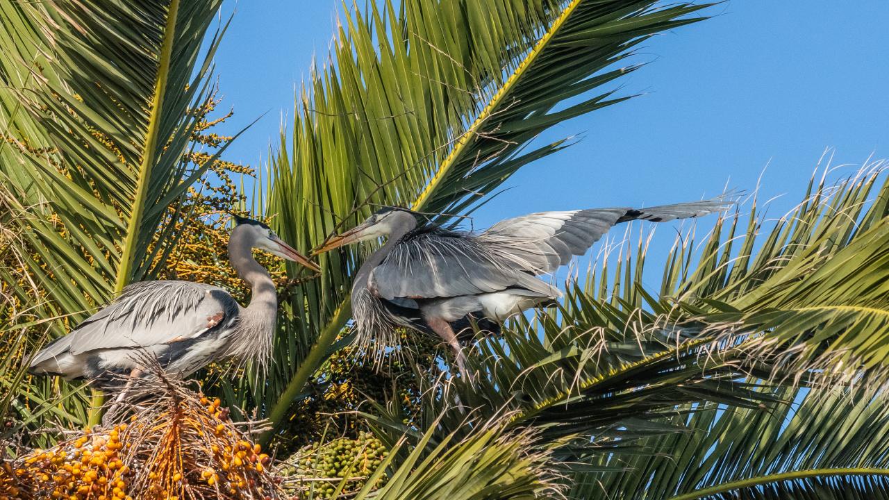 Wallpaper Two gray pelicans are sitting in palm leaves