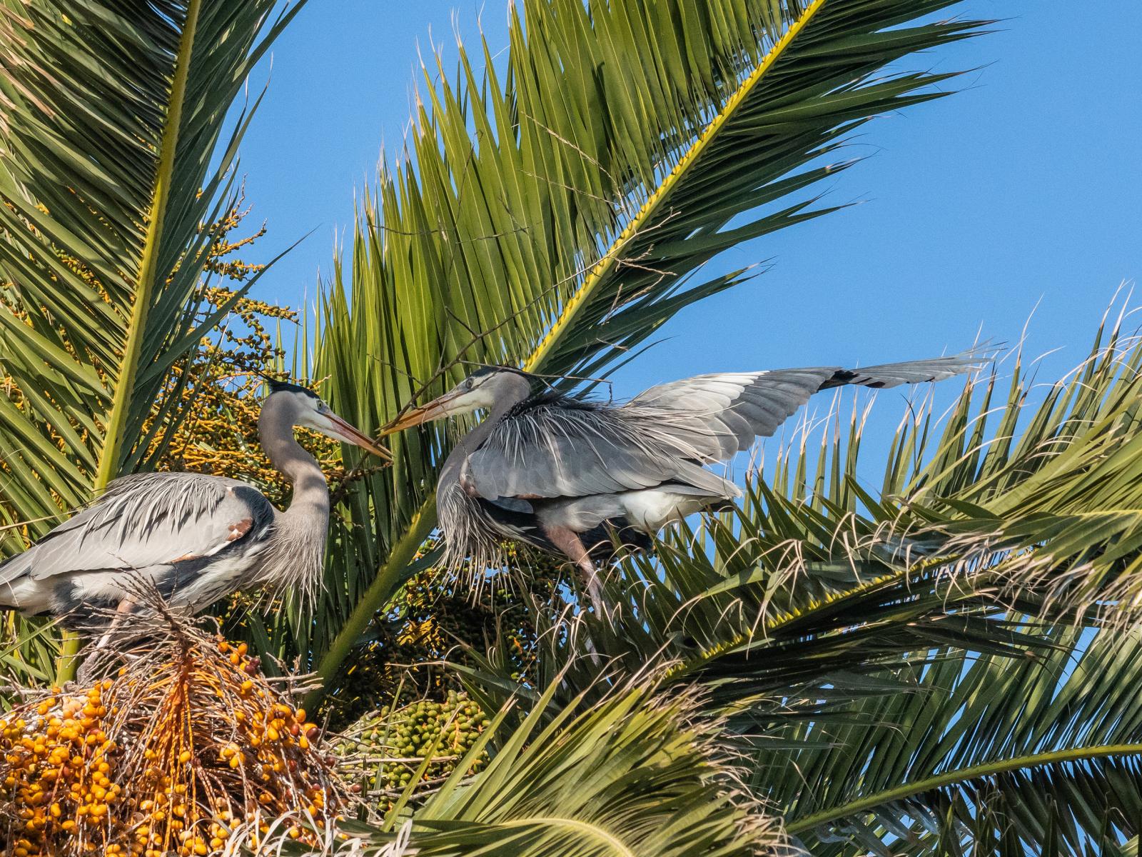 Wallpaper Two gray pelicans are sitting in palm leaves