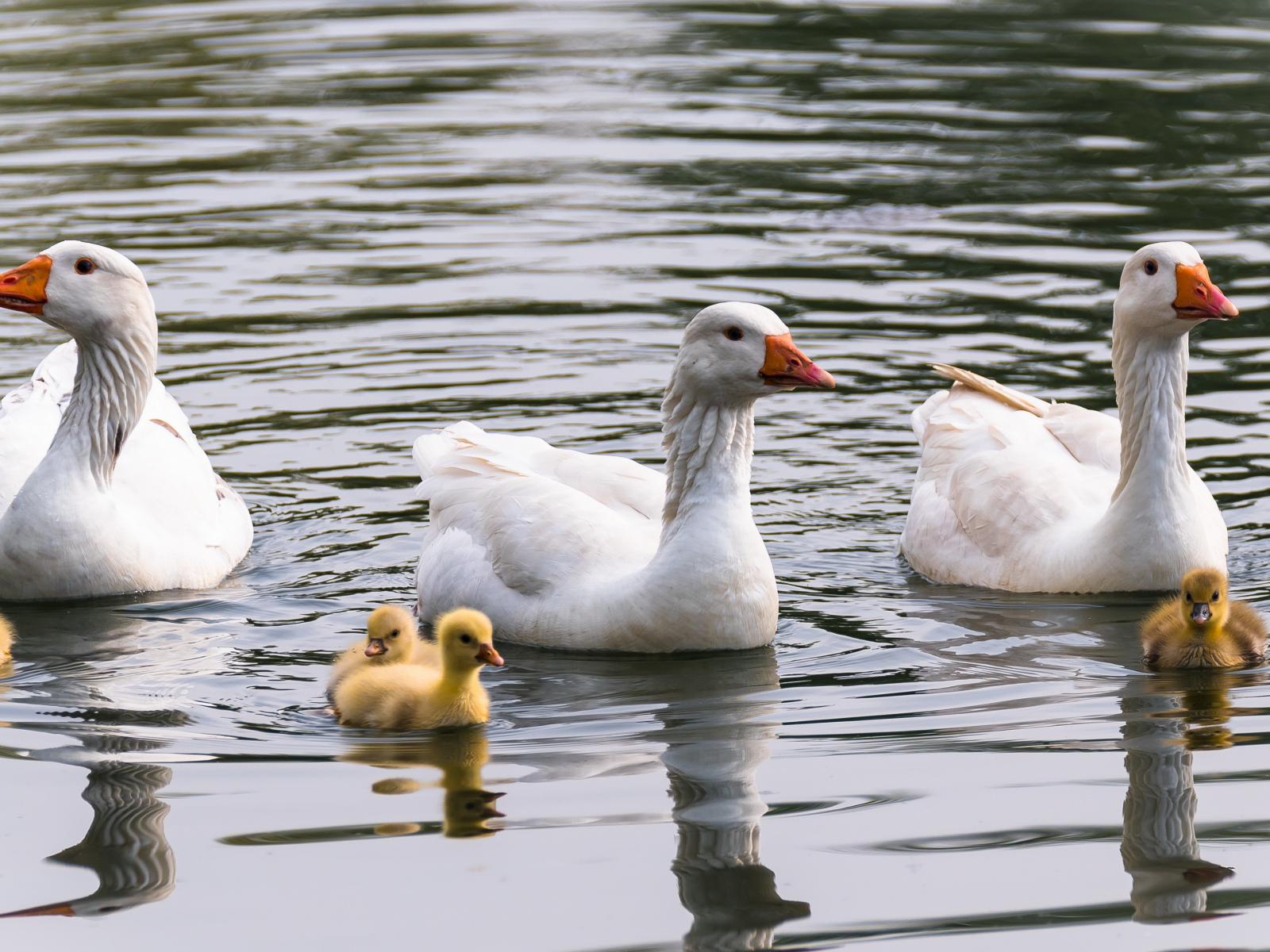 Wallpaper Three white geese with little chicks in the water