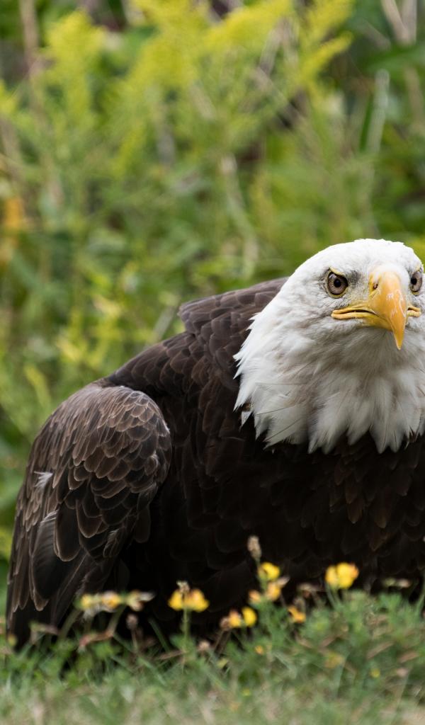 Wallpaper A large predatory bald eagle sits in the grass.