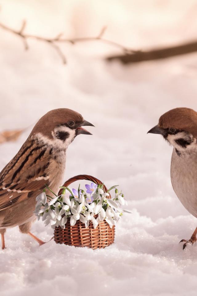 Wallpaper Two little sparrows with flowers in the snow
