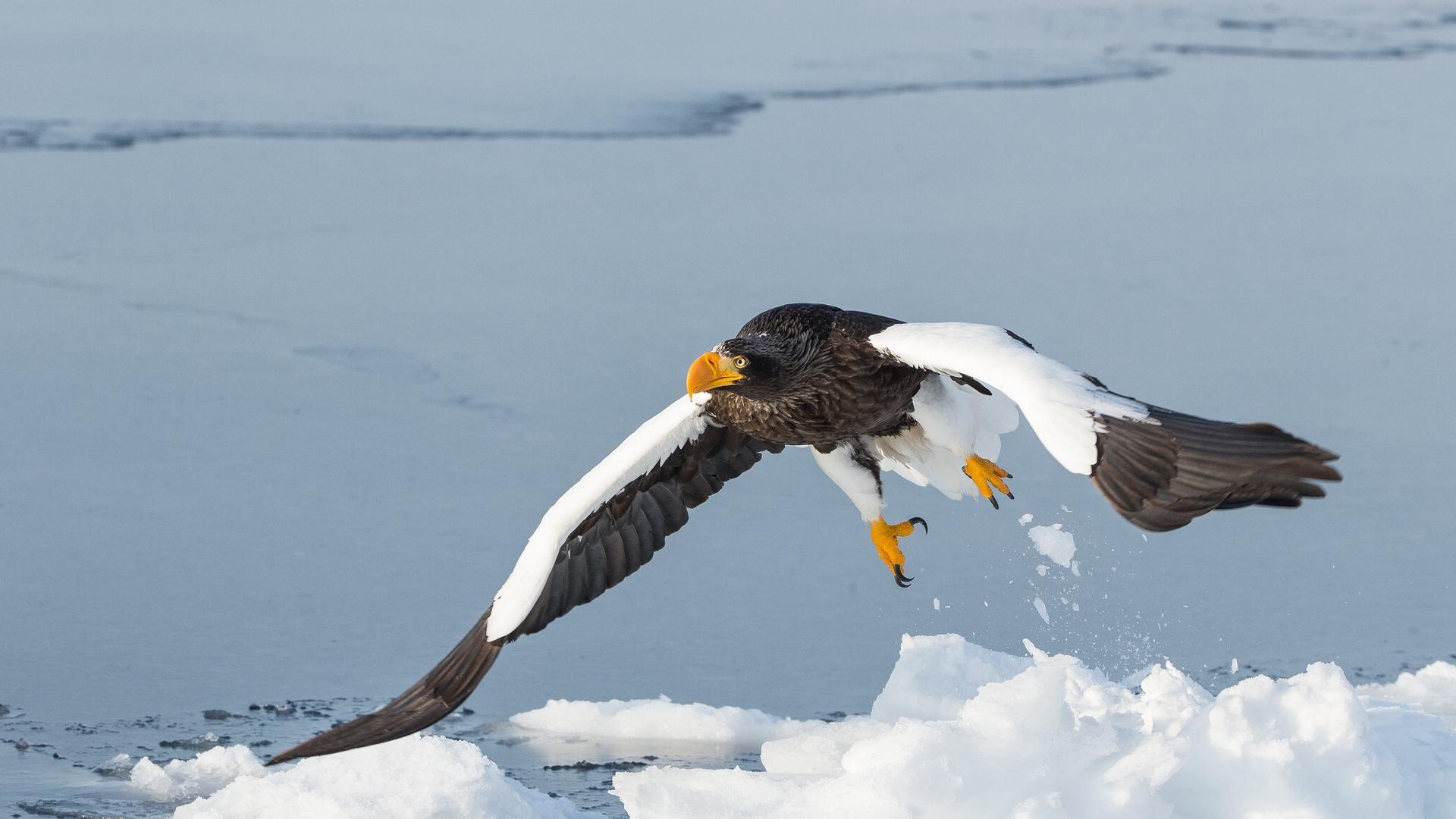 Wallpaper Large bird of prey above the frozen river