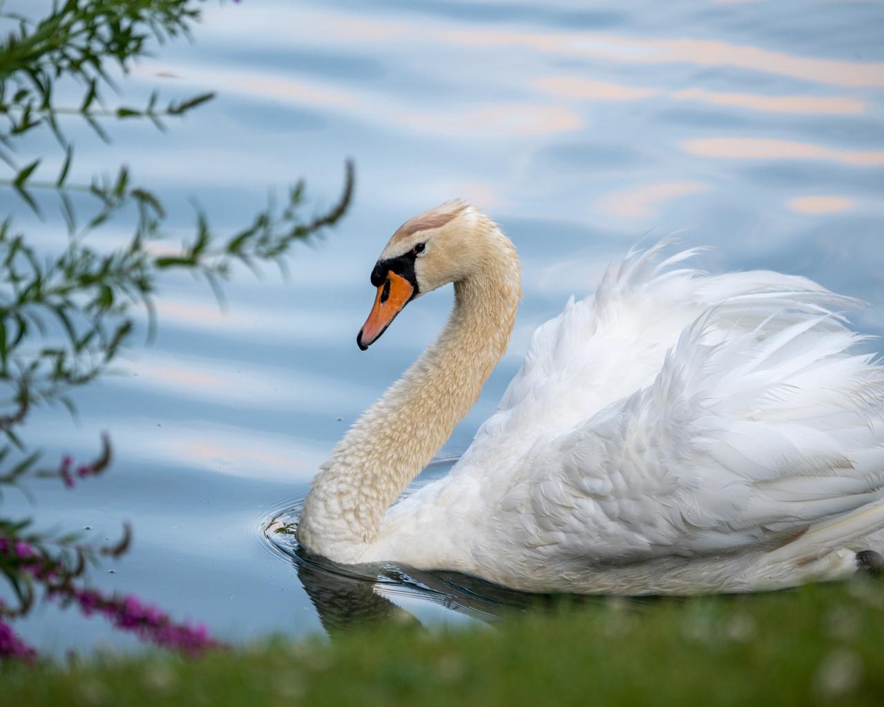 Wallpaper Beautiful white swan on the shore of the pond