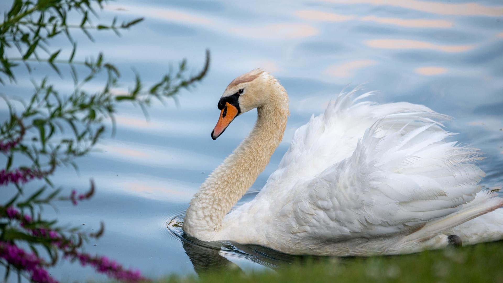 Wallpaper Beautiful white swan on the shore of the pond