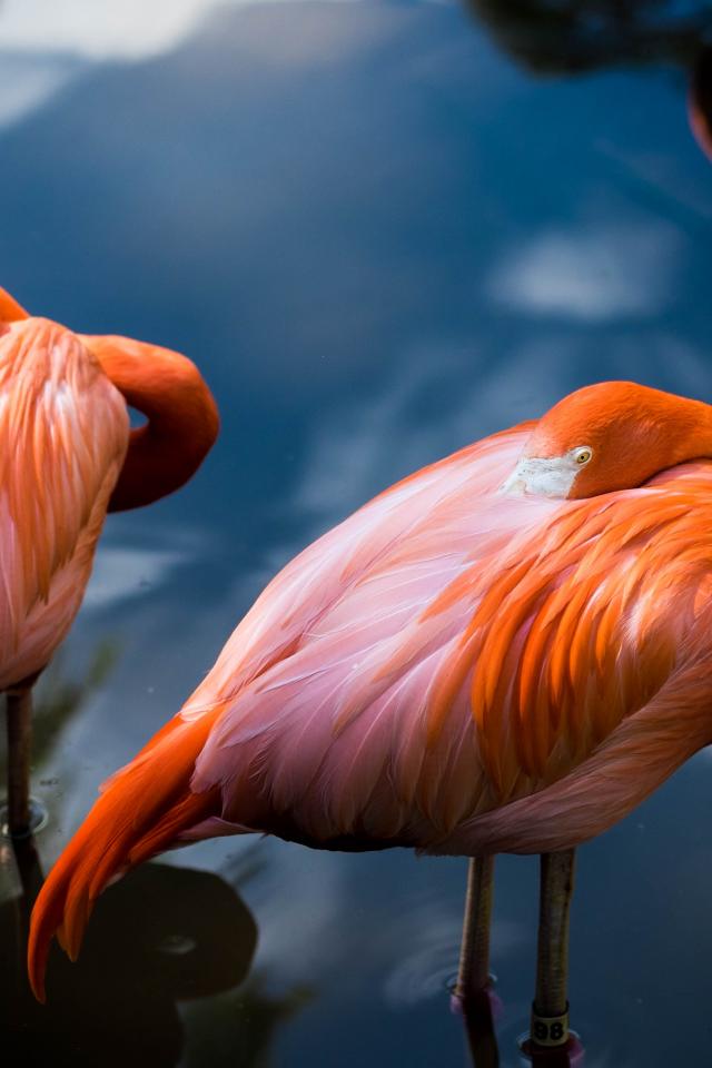 Wallpaper Two pink flamingos hide their beak in feathers
