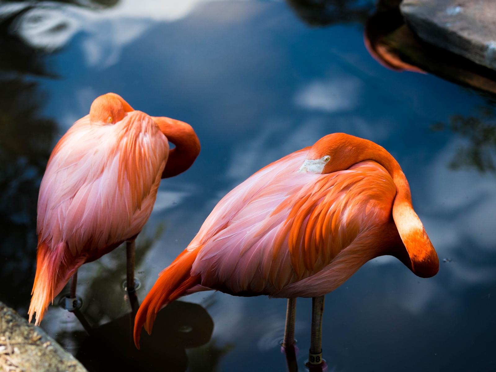 Wallpaper Two pink flamingos hide their beak in feathers