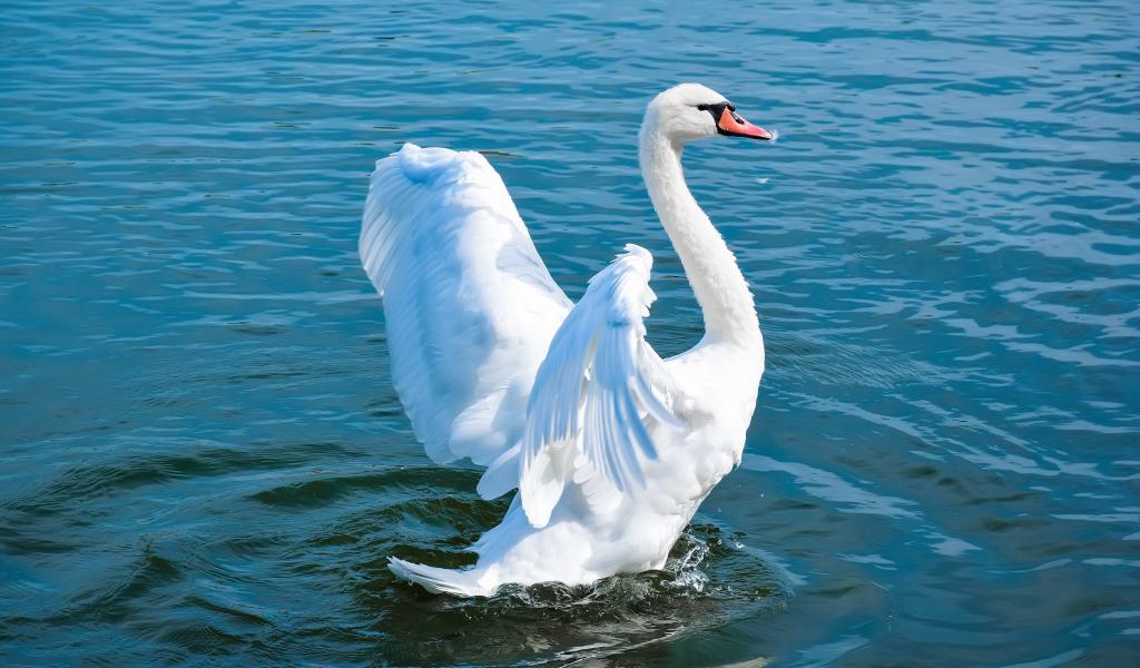 Wallpaper Big white swan flies up on the water