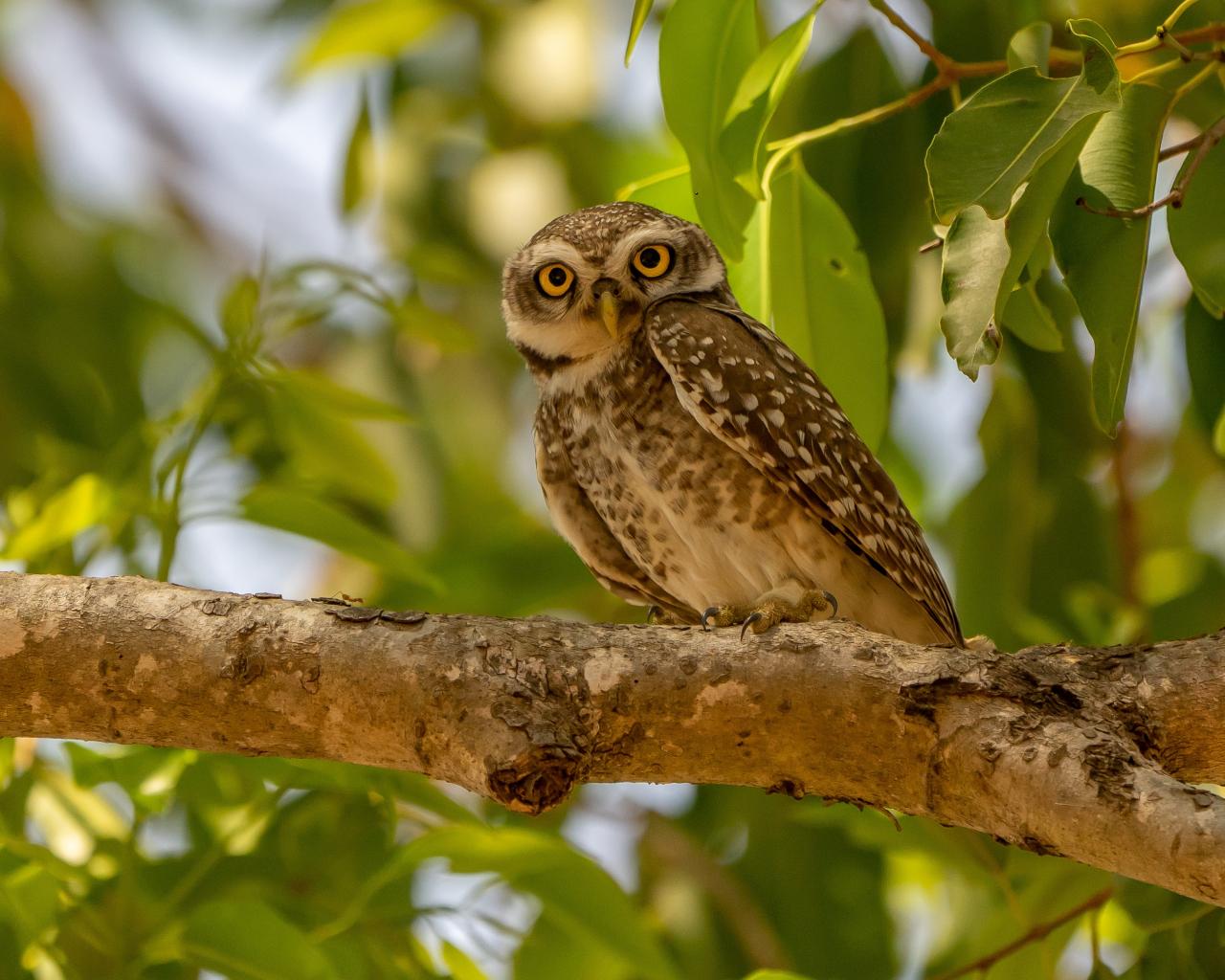 Wallpaper Owl sits on a tree branch in green leaves