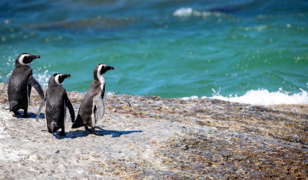 Wallpaper Three little penguins on a stone by the water