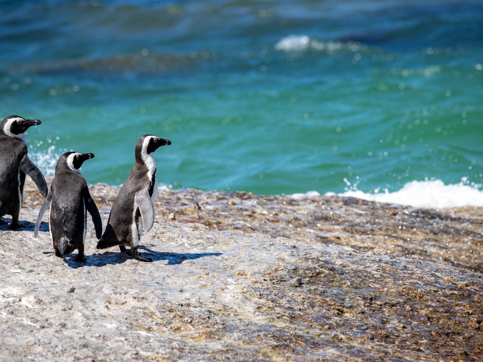 Wallpaper Three little penguins on a stone by the water