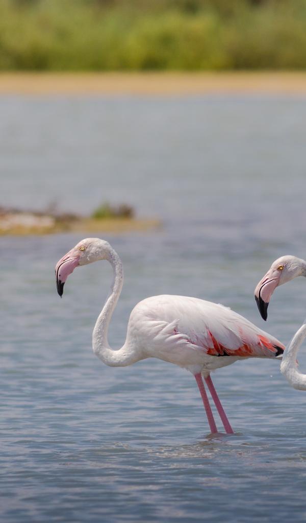 Wallpaper Two flamingos stand in the water