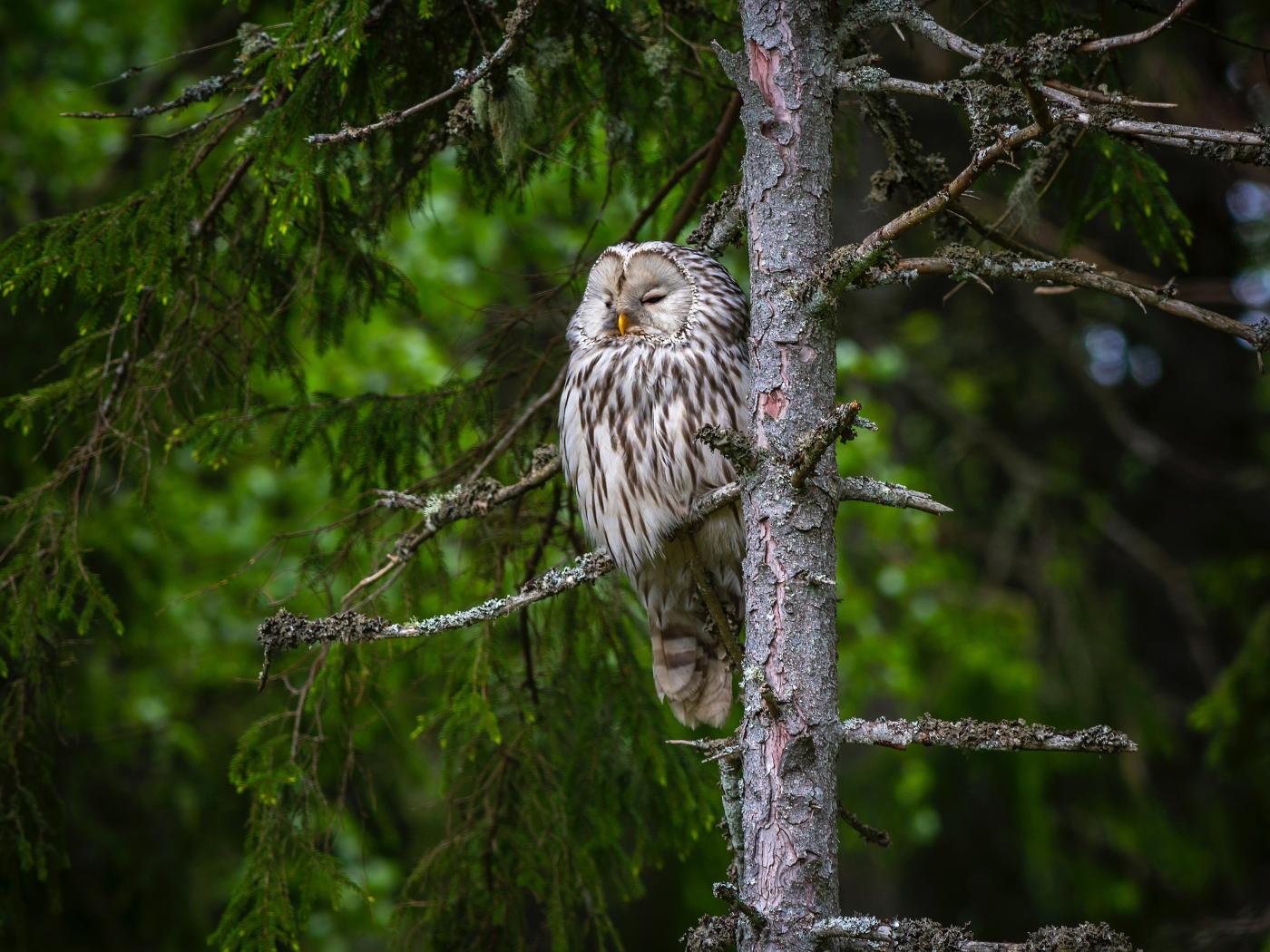 » Wallpaper Big sleepy owl on a spruce branch