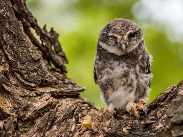 Wallpaper Owl winks on a tree