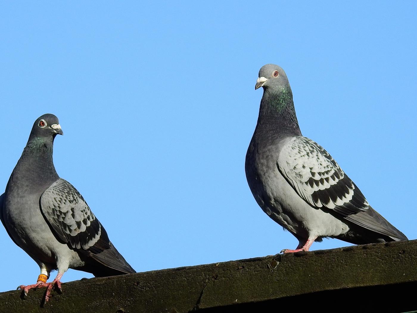 Wallpaper Two pigeons sit on the roof against the blue sky