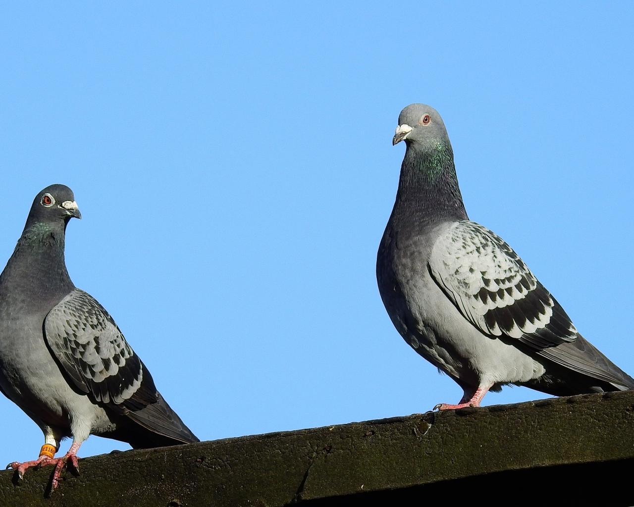 Wallpaper Two pigeons sit on the roof against the blue sky