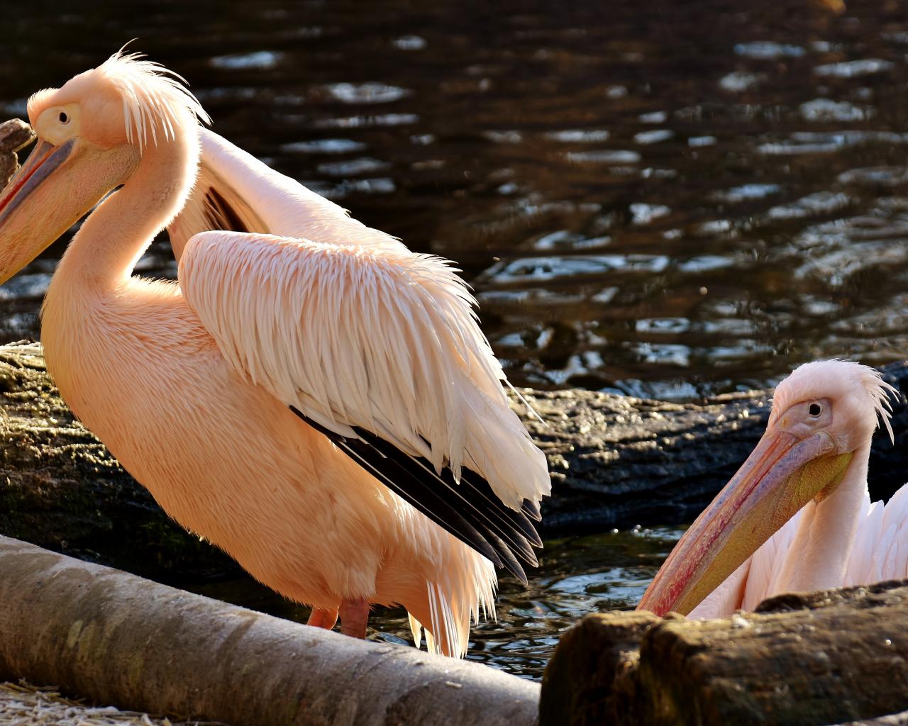 » Wallpaper Two pink pelicans by the water
