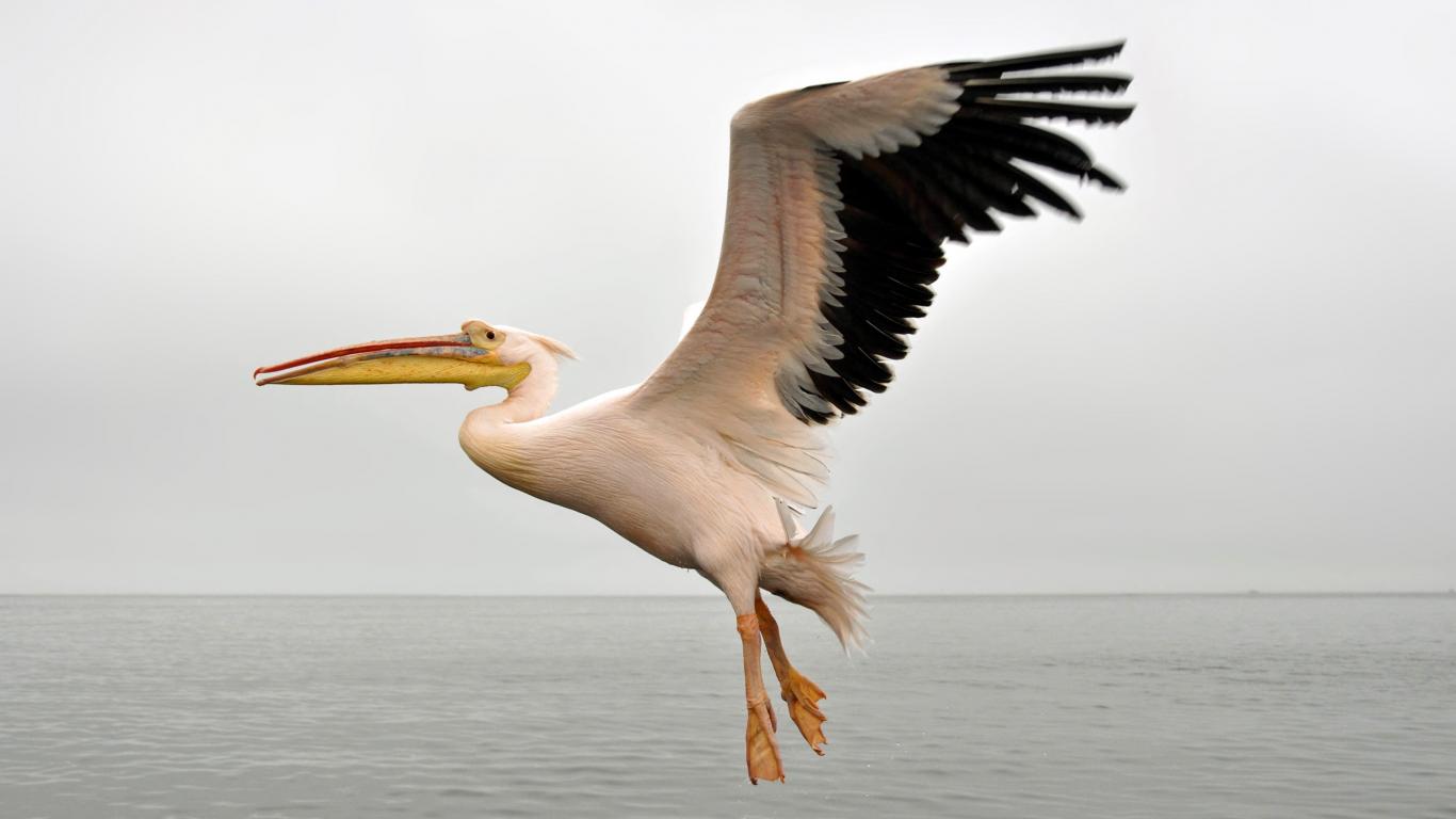 Wallpaper Large pelican with black wings above the water