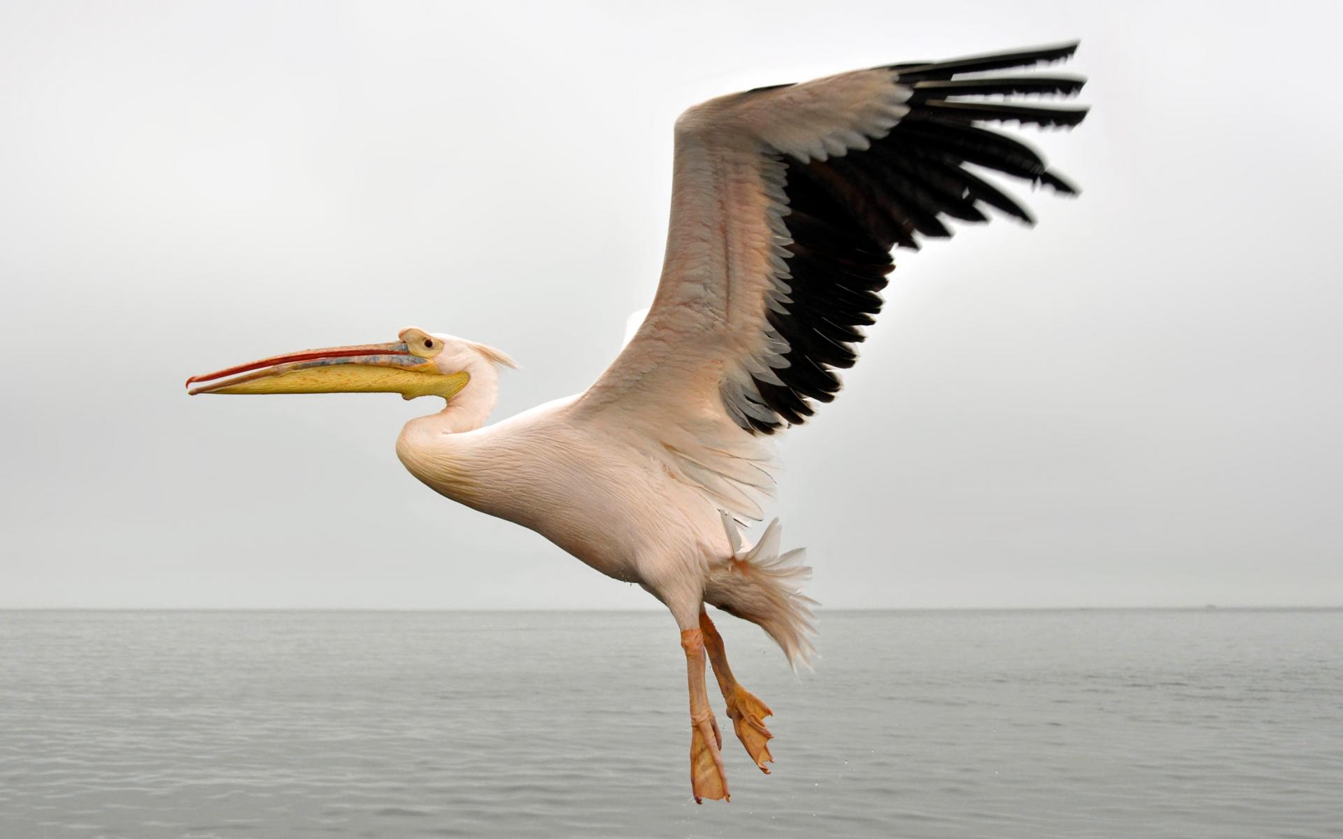 Wallpaper Large pelican with black wings above the water