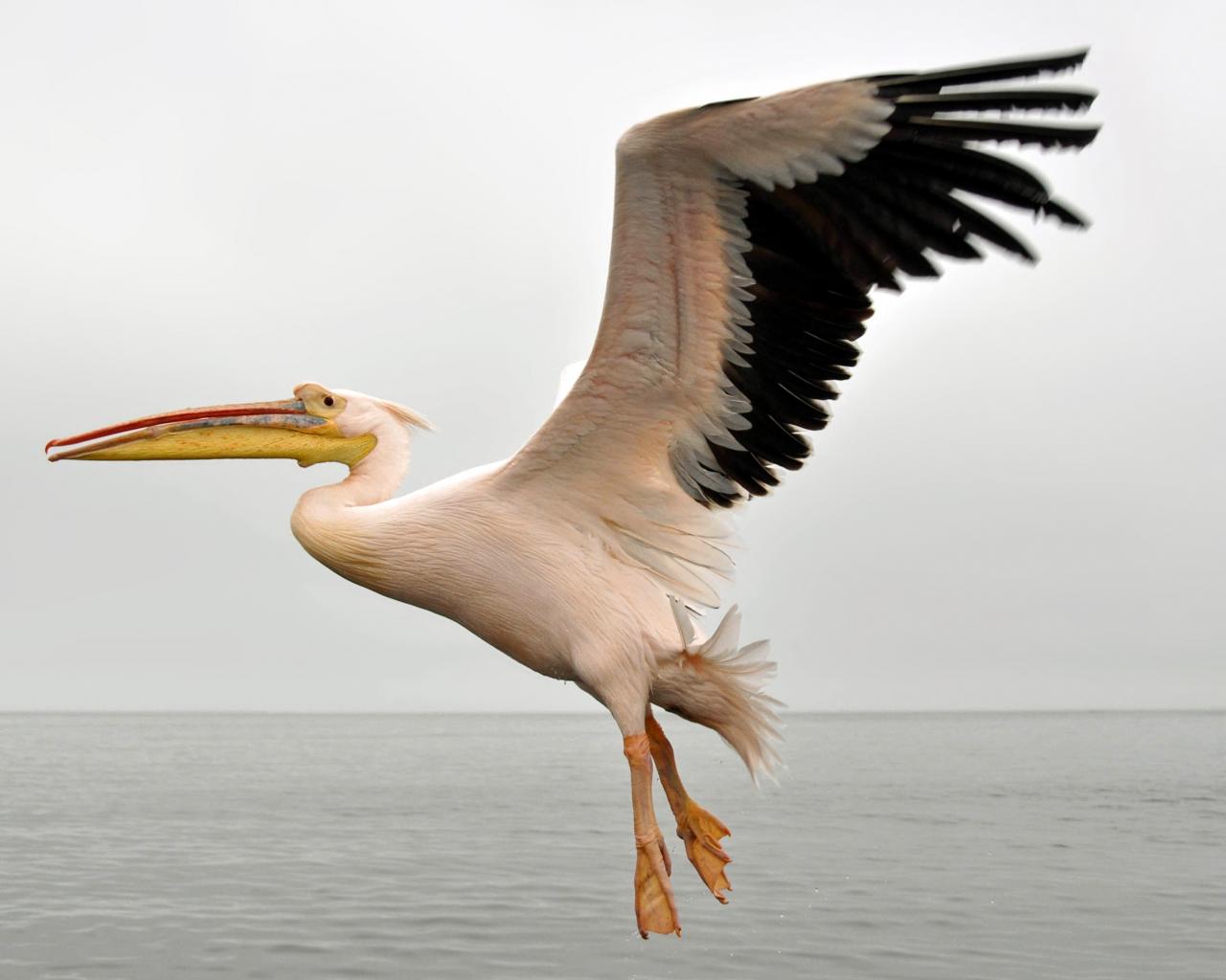Wallpaper Large pelican with black wings above the water