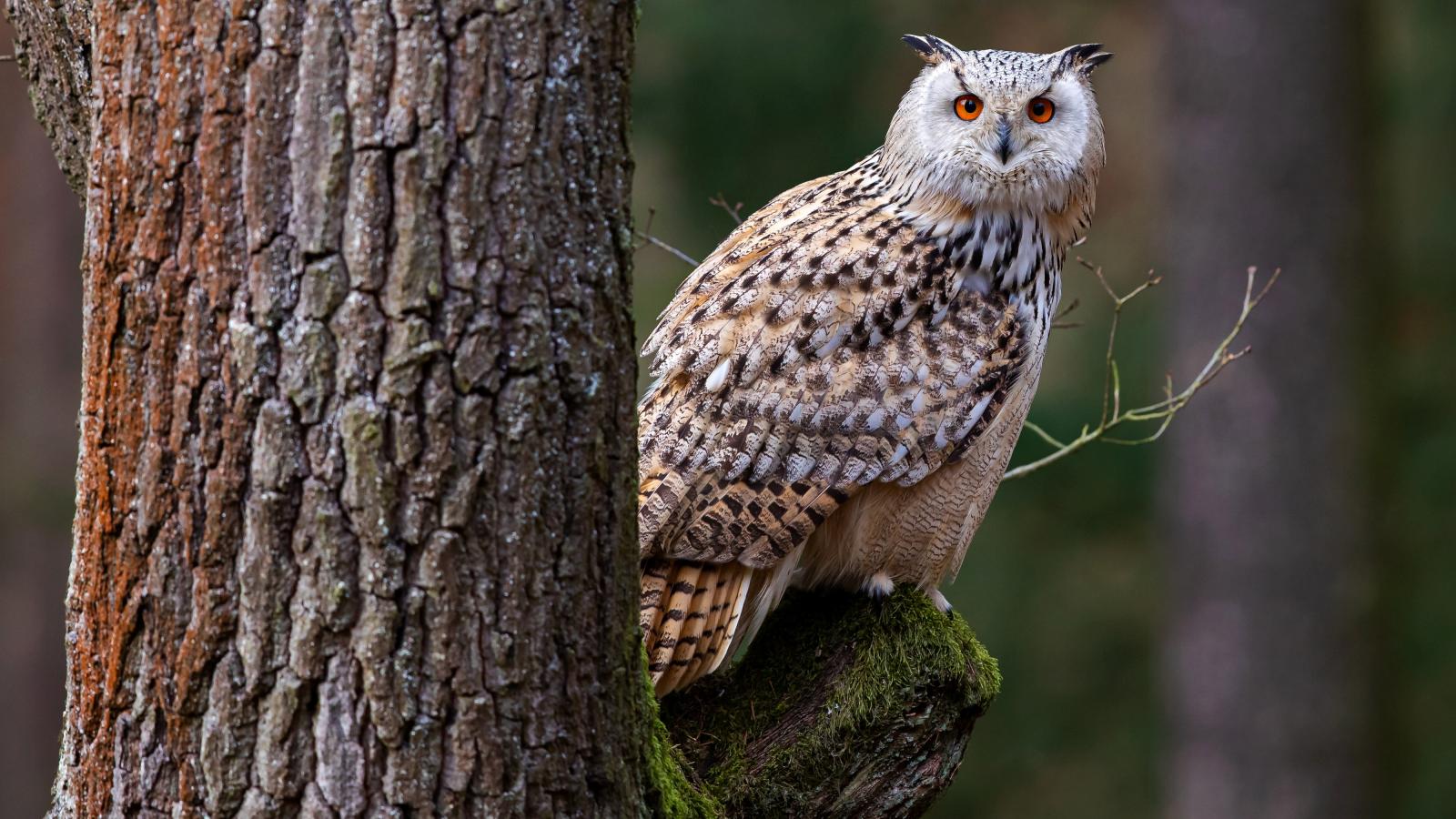 Wallpaper A large owl sits on a moss-covered branch