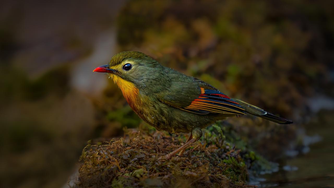Wallpaper Little red-billed leiotrix bird on the ground
