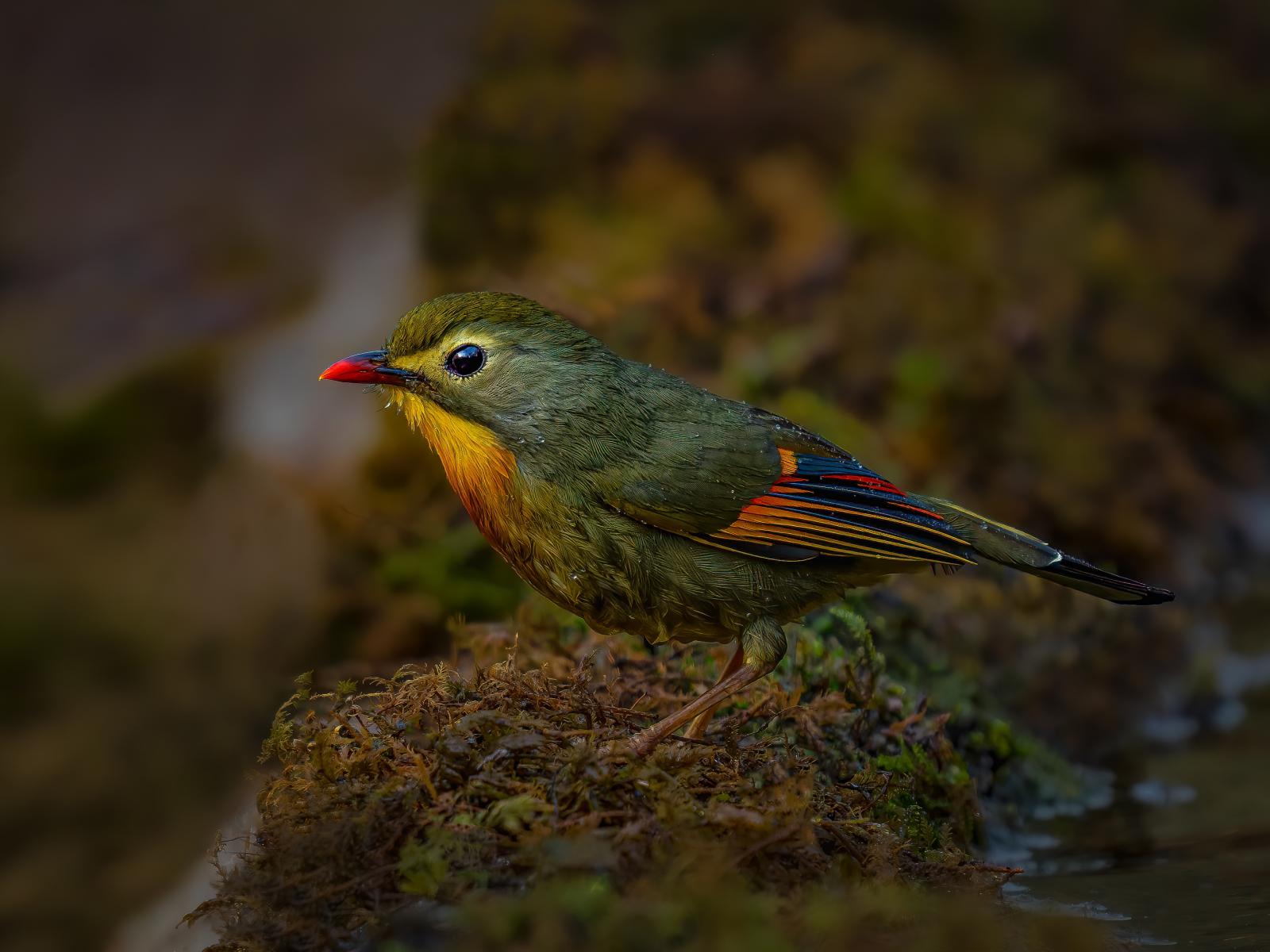 Wallpaper Little red-billed leiotrix bird on the ground