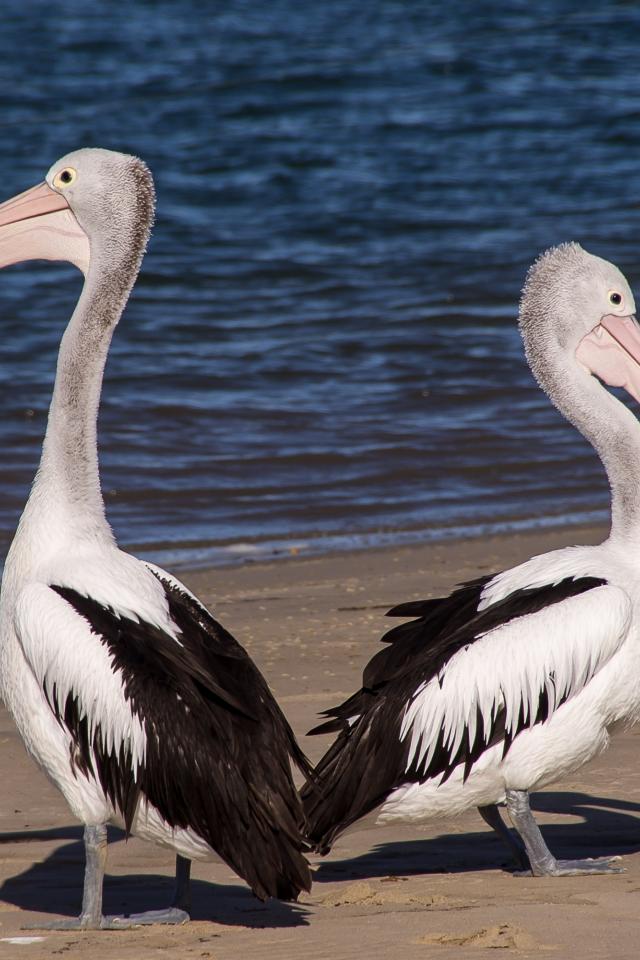 Wallpaper Two pelicans stand on wet sand by the sea