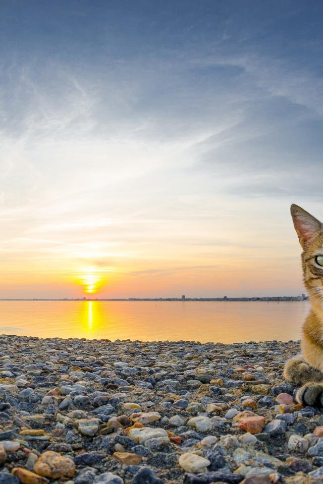 Wallpaper The cat lies on the shingle beach at sunset