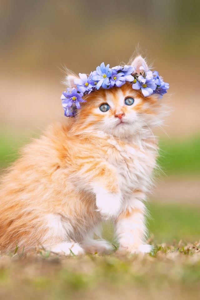 Wallpaper Red fluffy kitten with a wreath of flowers on his head