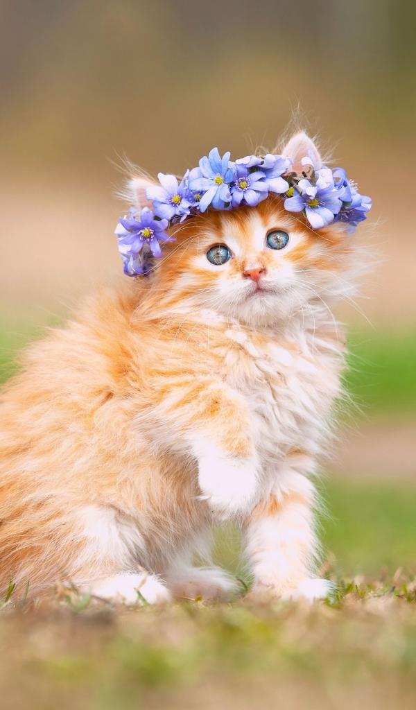 Wallpaper Red fluffy kitten with a wreath of flowers on his head