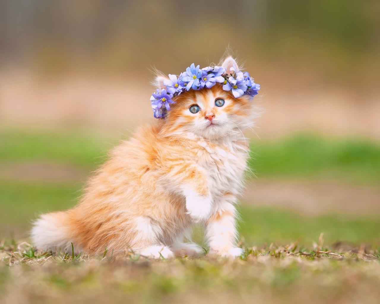 Wallpaper Red fluffy kitten with a wreath of flowers on his head