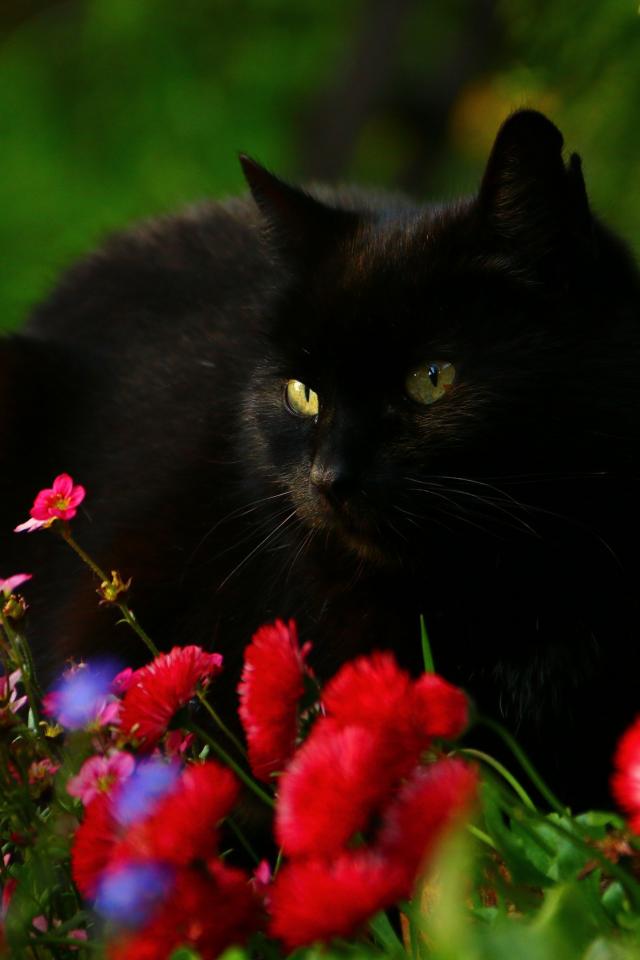 Wallpaper Beautiful black cat in flowers