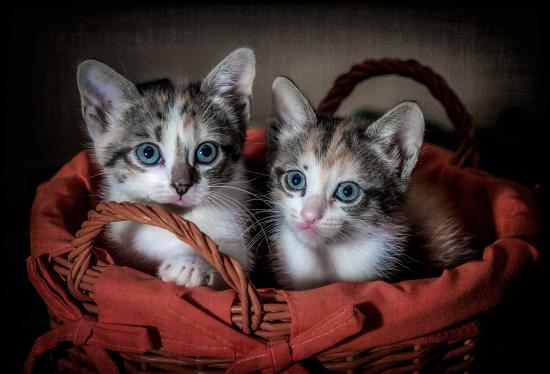 Wallpaper Cute gray kittens sit in a wicker basket.