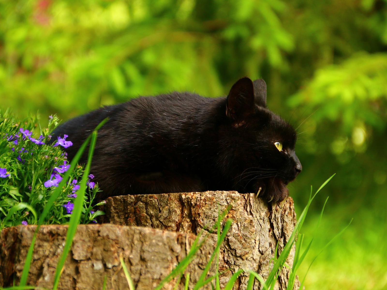 Wallpaper A beautiful black cat lies on a stump