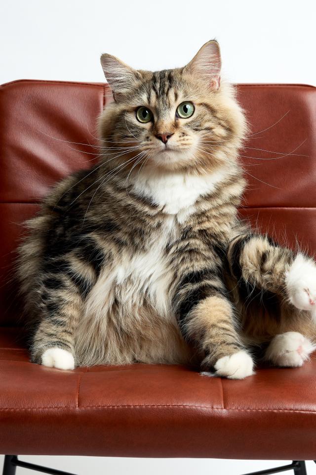 Wallpaper A cat sits in a brown chair on a white background