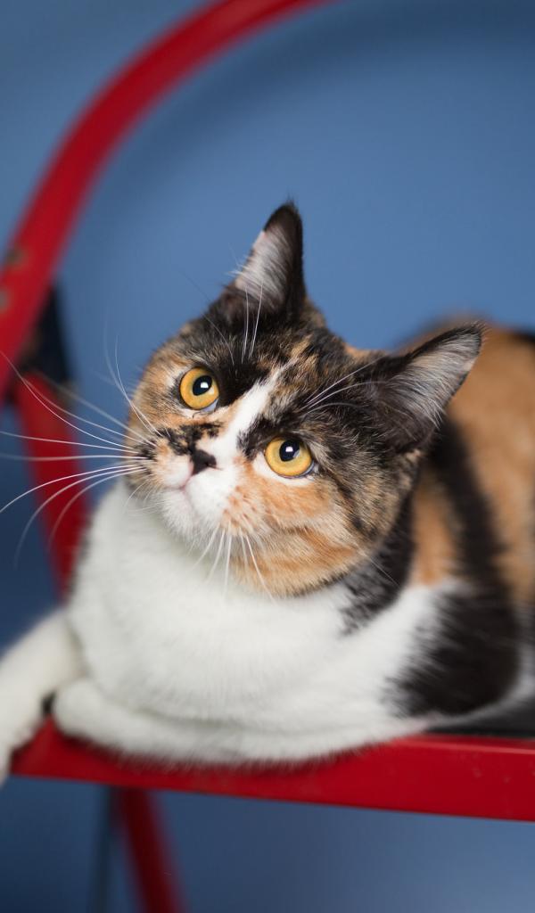 Wallpaper Three-color funny cat sitting on a red chair