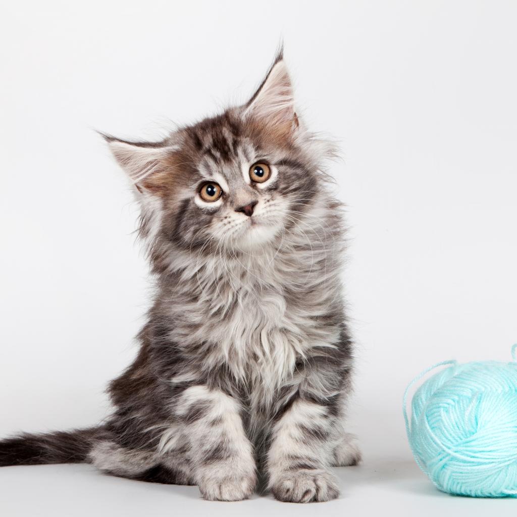 Wallpaper Gray kitten of Maine Coon breed with a ball of blue threads