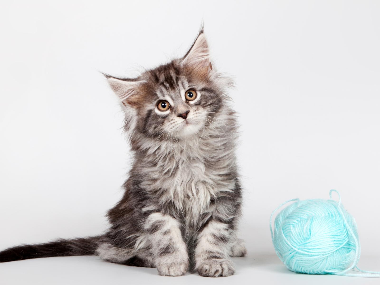 Wallpaper Gray kitten of Maine Coon breed with a ball of blue threads