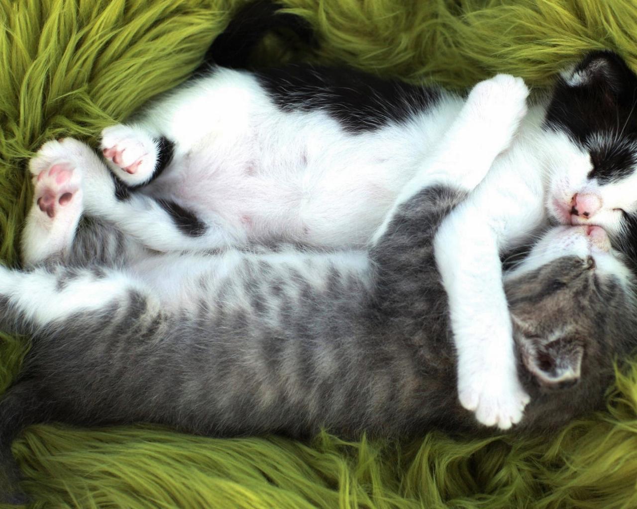 Wallpaper Two little funny kitten sleep embracing