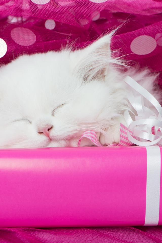 Wallpaper Fluffy white kitten asleep on a pink gift box