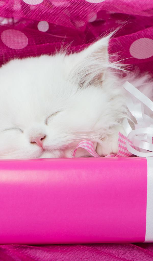 Wallpaper Fluffy white kitten asleep on a pink gift box