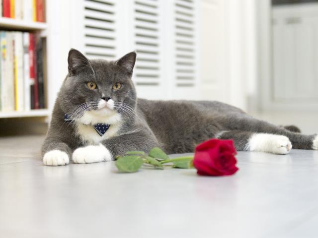 Wallpaper Gray cat lying on the floor with a red rose