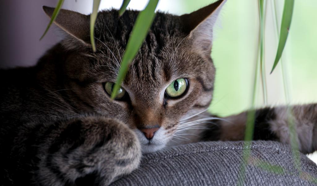 Wallpaper Green-eyed gray cat lying on the couch