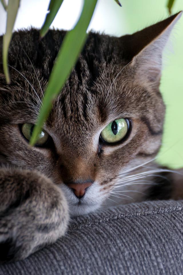 Wallpaper Green-eyed gray cat lying on the couch