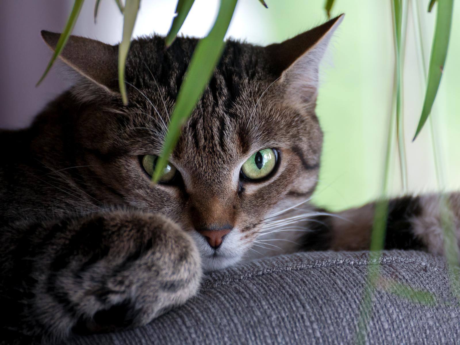 Wallpaper Green-eyed gray cat lying on the couch