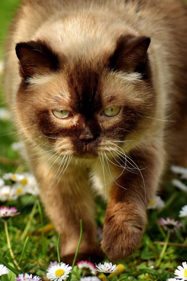Wallpaper A large Siamese cat walks through white flowers to daisies