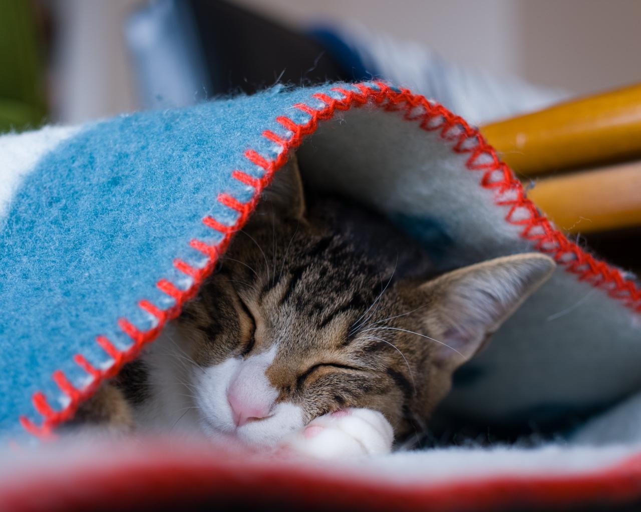 Wallpaper Gray cat sleeps under a warm blanket
